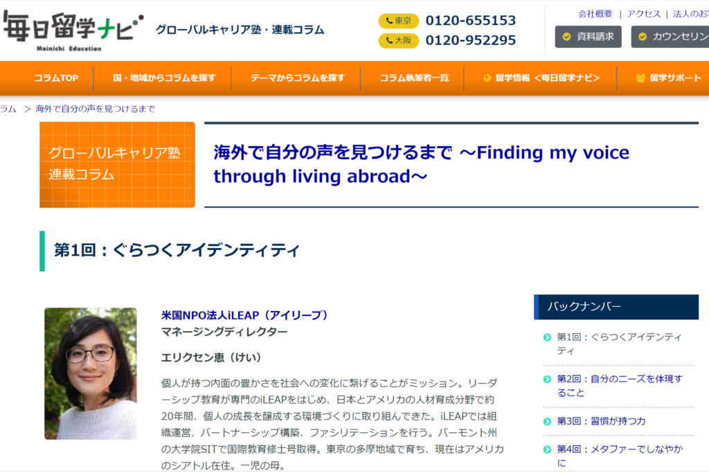 アメリカ在住15年目。海外に暮らしているからこそ見えてきたものを、グローバルキャリア塾・連載コラム「海外で自分の声を見つけるまで~Finding my voice through living abroad」で2020年から連載しています。